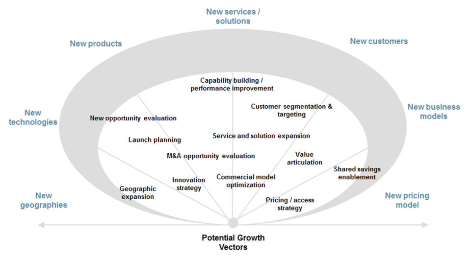 - Service and solution expansion: Medical device companies are not only expected to provide innovative devices but are increasingly expected to do so as part of a broader solution that addresses a specific problem/need, whether clinical or operational in nature. Solutions should ideally incorporate the three elements of products, services and data and, ideally, should include ways to measure/track performance (if not explicitly linked to payments). We have extensive experience in helping medtechs expand into services and solutions across many hospital departments (e.g., OR, pharmacy, lab) and care settings (e.g., ASCs). We can help develop integrated solutions by prioritizing customers’ unmet needs and then defining the range of technologies, services and data required to address them. Moreover, we have deep experience in defining and implementing the organizational changes required to effectively deploy these new solutions.